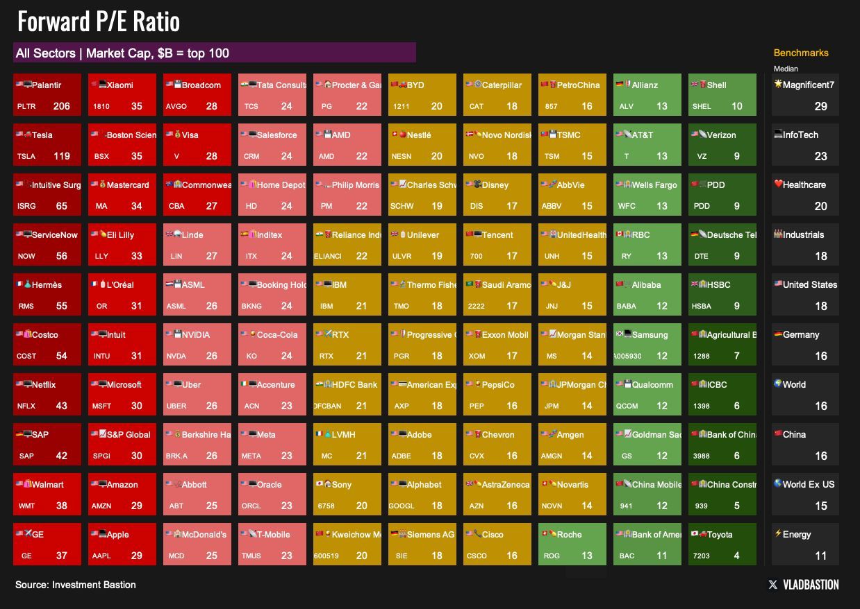 Trotz der besseren relativen Performance in diesem Jahr bleibt der Bewertungsabschlag chinesischer Aktien enorm. Der MSCI China Index (bzw. die entsprechenden ETFs) handeln mit einem Kurs-Gewinn-Verhältnis im Bereich von 10 bis 11, während der S&P 500 weiterhin ein KGV von über 20 aufweist. Auch das Kurs-Buchwert-Verhältnis ist mitunter halb so hoch wie das vergleichbarer US-Titel. Die untere Übersicht zeigt die Bewertungen der größten 100 börsennotierten Unternehmen weltweit. Nimmt man die zukünftigen Gewinnprognosen zum Maßsstab, dann weisen US-Tech-Unternehmen die höchsten Bewertungen auf, während die großen chinesischen Unternehmen einstellige KGVs aufweisen.