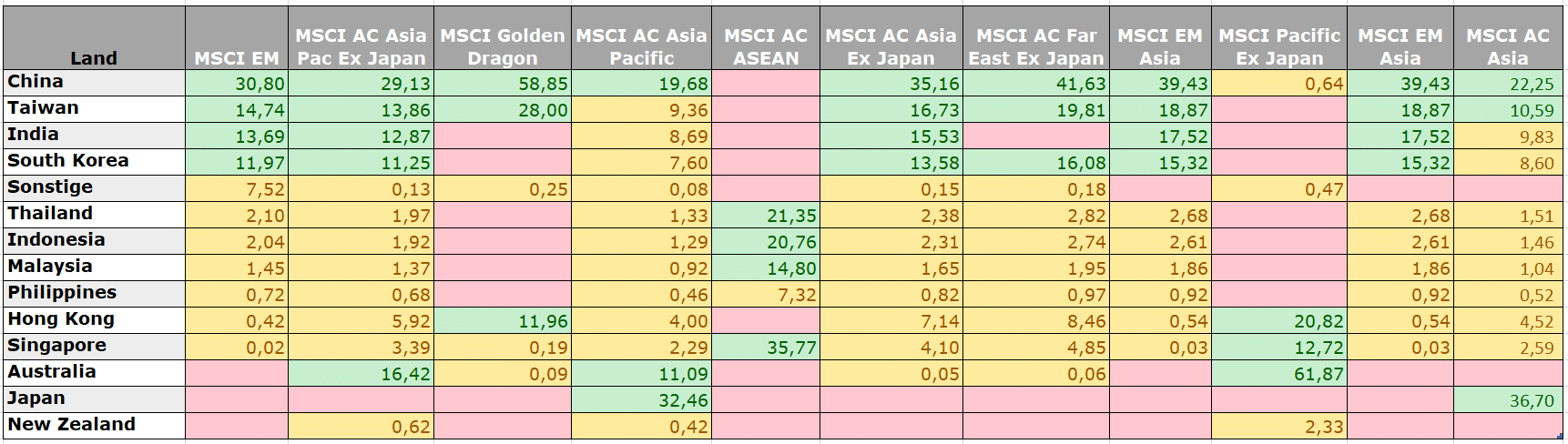 Wer in Asien investieren will, hat höchstwahrscheinlich Schwellenländer im Blick. Wer aber bei seinem Asien-Fonds oder -ETF das Kürzel “DM” und/oder “Pazifik” vorfindet, landet bei einem Portfolio, das fast nur aus Japan und Australien besteht. DM steht für Developed Markets, und dann sind Aktien aus China, Taiwan und Indien (und viele weitere Länder) nicht dabei. Gelegentlich, leider nicht immer, gibt das Kürzel “EM” Aufschluss, ob es sich bei einem Asien-Fonds oder -ETF über ein breit streuendes Produkt handelt.