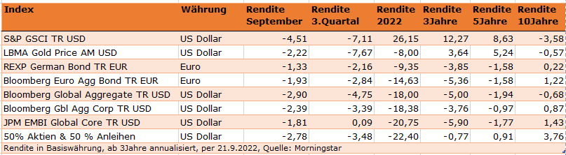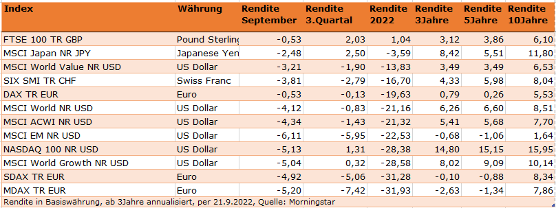 US-Aktien reagierten entsprechend negativ. Nasdaq und Dow rauschten um jeweils mehr als 1,7 Prozent in die Tiefe, und auch die Märkte in Europa starteten den Tag mit Abschlägen. Angesichts der Zinserhöhungen in den USA, der Verschärfung des Krieges in der Ukraine und die Gefahr einer möglichen nuklearen Eskalation geriet heute aus dem Blick, dass die Schweizer Notenbank heute die Zinsen ebenfalls um 75 Basispunkte erhöhte und die japanische Notenbank nach langem Zögern erstmals seit Ende der 1990-er Jahre Stützungskäufe vornahm, um den Yen zu stützen. Wir leben in bewegten Zeiten!