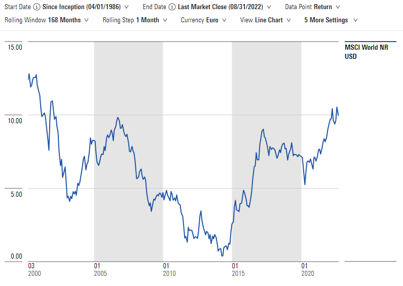 Rollierende, annualisierten 14-Jahresrenditen, in Euro, Stand: 31.8.2022, Quelle: Morningstar