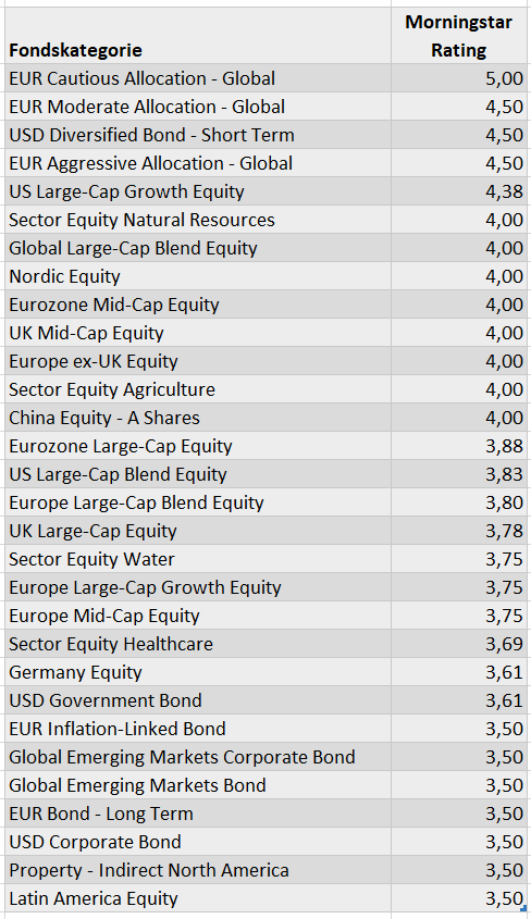 Als Messlatte für den Erfolg verwenden wir die beliebten Morningstar Sterne Ratings. Sie bilden die risikoadjustierte Performance von Fonds ab, ausgedrückt in einem Rating. Die Morningstar Sterne Ratings sind ein quantitatives, relatives Maß, das Fonds einer Kategorie vergleicht. Sie werden in Form von Sternen (1-5) vergeben. Der Vorteil dieses Ratings ist, dass die Vergangenheits-Rendite ins Verhältnis zum Abwärtsrisiko gesetzt wird. Besonders riskante Fonds werden also tendenziell schlechter bewertet. Ein weiterer Vorteil dieses Ratings ist, dass es nach recht fein differenzierten Kategorien vergeben wird. Das stellt sicher, dass Äpfel mit Äpfeln verglichen werden. Dabei werden ETFs und aktiv verwaltete Fonds nach denselben Maßstäben innerhalb der Kategorien bewertet.