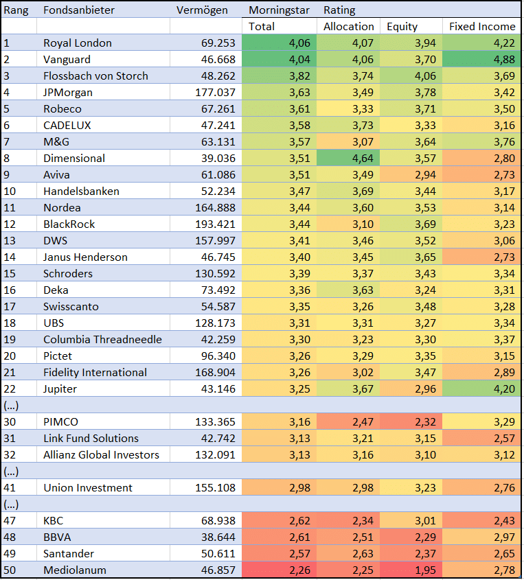 Die obere Tabelle zeigt das Ranking der größten europäischen Fondshäuser. Die besten Fonds kommen vom britischen Haus Royal London. Das durchschnittliche Sterne-Rating liegt bei 4,07 von fünf Sternen. Angesichts der Tatsache, dass Royal London in 50 Fonds ein Vermögen von rund 70 Milliarden Euro verwaltet, ist dieses gute Rating für Generalisten ein sehr gutes Ergebnis. Leider sind die Fonds dieses Hauses nicht für Anleger in Deutschland erhältlich. Royal London ist in erster Linie auf die Verwaltung von Pensionsgeldern in Großbritannien konzentriert. Dennoch ist das Ergebnis für Anleger in Deutschland vielsagend: Die Produkte dieses Hauses zählen zu den günstigsten Fonds auf dem europäischen Kontinent.