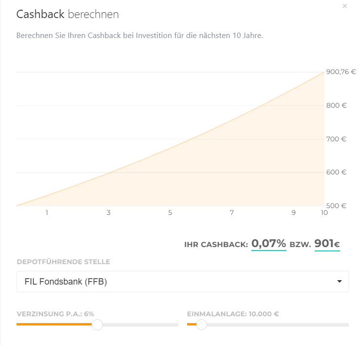 Angenommene Verzinsung der umgehend wiederangelegten Cashbacks und einer Einmalanlage von 10.000 Euro nach zehn Jahren, Quelle: envestor