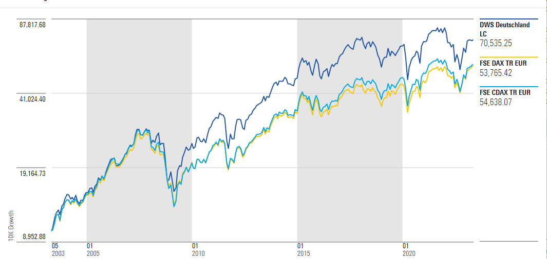 „Mission erfüllt“, lautet das Fazit einer langfristigen Performance. Seit Mai 2003 konnte der DWS Deutschland aus einem hypothetischen Startkapital von 10.000 Euro (per 10.5.2023) ein Ergebnis von gut 70.000 Euro erzielen – verglichen mit 53.700 Euro beim DAX und 54.600 Euro beim CDAX.