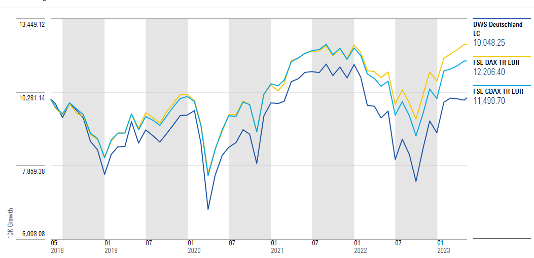 Zunächst zu den Märkten: Seit 2018 schwankten die Märkte erheblich. Auf eine Korrektur 2018 folgte die Corona-Krise 2020 und im Jahr 2021/22 korrigierten Aktien erneut im Zuge der russischen Ukraine-Invasion. Vor allem Nebenwerte brachen ein. Diese kurze Abfolge an volatilen Marktphasen hat die Performance des DWS Deutschland überdurchschnittlich beeinträchtigt, weil er rund ein Fünftel der Fondsgelder in Nebenwerte investiert. Zudem war ein wichtiger Bestandteil der Fondsstrategie, durch den Einsatz von Derivaten den Markt in Aufwärtsphasen outzuperformen. Das ist langfristig und auch kurzfristig so eingetreten, aber weil an der Börse bekanntlich nicht zum Ausstieg geklingelt wird, verliert der Fonds überdurchschnittlich viel in Abwärtsphasen.