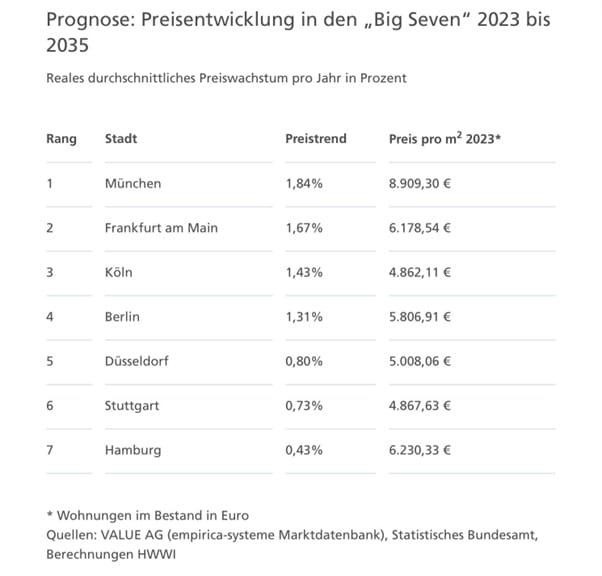 Laut einer Prognose der Postbank wird für etwa 40 Prozent der deutschen Landkreise in den nächsten zehn Jahren ein realer Wertverlust erwartet. In den sieben großen Metropolen liegt die prognostizierte jährliche Wertsteigerung zwischen 0,4 Prozent (Hamburg) und 1,8 Prozent (München). Für unsere Modellrechnung nehmen wir eine moderate Wertsteigerung von 1 Prozent an.