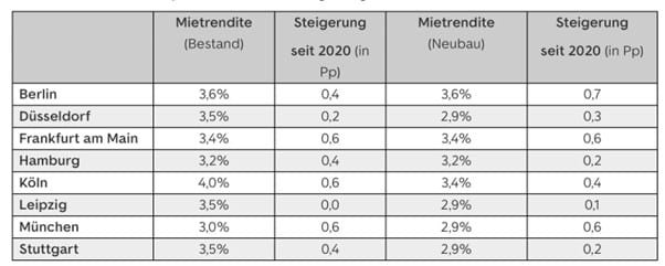 Anders als bei Mehrfamilienhäusern sind die Preise für Eigentumswohnungen und Einfamilienhäuser deutlich weniger stark gefallen. Die Bruttomietrendite – also die Rendite vor Abzug von Kosten wie Instandhaltung, Verwaltung und Grundsteuer – liegt in deutschen Metropolen weiterhin bei durchschnittlich 3 bis 4 Prozent. In guten Lagen beträgt sie oft nur zwischen 2 und 3 Prozent.