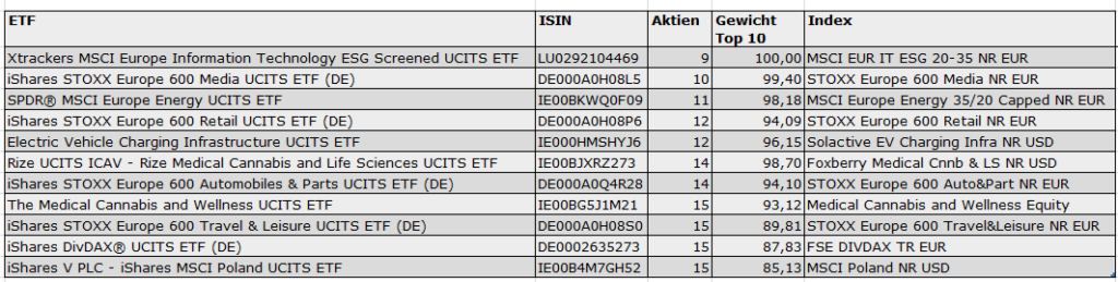 Anders sieht es bei ETFs aus. Sie müssen so konstruiert sein, dass sie die Performance von Marktbarometern widerspiegeln. Das kann bedeuten, dass bis zu 35 Prozent des ETF-Vermögens im Top-Titel investiert ist, und bei den restlichen Bestandteilen des Index liegt das Limit bei stolzen 20 Prozent. Auch das ist gesetzlich geregelt. ETFs unterliegen also nicht den Diversifikationregeln von Fonds, auch wenn sie in jedem anderen Punkt aktiv verwalteten Fonds gleichgestellt sind. Die konzentriertesten ETFs am Markt (Tabelle) kommen mit neun Aktien aus. Die Top zehn Aktien machen in unserem unteren Beispiel zumeist mehr als 85 Prozent des ETF-Vermögens aus.