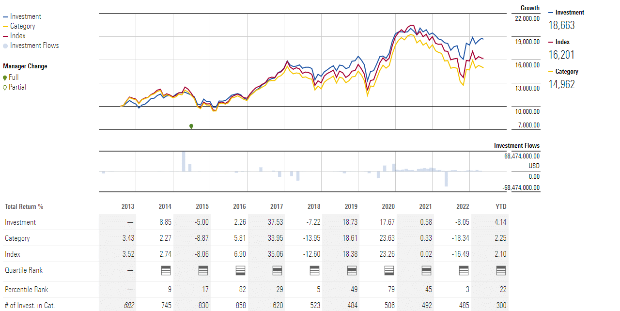 Oberer Chart zeigt die Performance in Prozent und in Euro von Fonds, Kategorie-Durchschnitt und Index, Quelle: Morningstar.