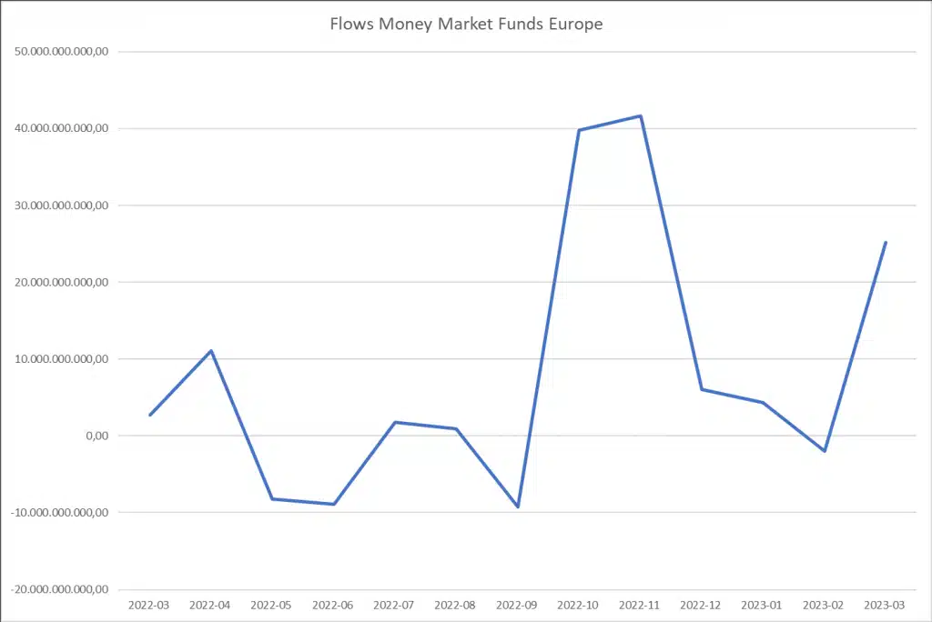 Die Attraktivität von Geldmarktfonds wird immer mehr Anlegern bewusst, die verstärkt ihre Konten plündern. In den USA sind derzeit Rekordzuflüsse in Geldmarktfonds zu beobachten, wobei das zum Teil auf die Angst von Anlegern vor Bankpleiten zurückgeht. In Europa ist die Nachfrage nach Geldmarktfonds zwar in den vergangenen 12 Monaten gestiegen, ist aber noch auf moderatem Niveau, wie die untere Grafik zeigt.