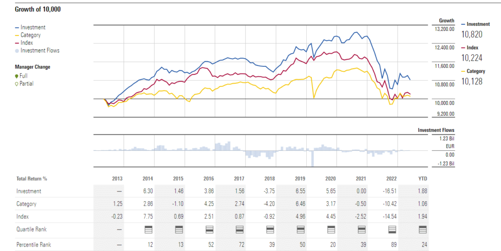 Der Fonds ist in Deutschland bereits seit zehn Jahren am Markt (im Heimatmarkt Großbritannien existiert die Strategie bereits seit 2008), und die Performance kann sich langfristig sehen lassen. In den vergangenen zehn Jahren lag der Fonds im zweiten Quartil flexibel anlegender Rentenfonds. Besonders gut lief es in den Jahren 2014, 2015 und 2020, als der Fonds deutlich vor den meisten Konkurrenzfonds lag. Dabei gab es kein klares Muster: Der Fonds outperformte in freundlichen Märkten (2019 und 2020), aber auch in Zeiten schwacher Märkte (2018). Aber das bringt uns schnurstracks zum Horrorjahr 2022. Der Fonds brach um 16,5 Prozent ein und verlor damit deutlich mehr als vergleichbare Fonds. Dieser Einbruch verhagelte die kurz- und mittelfristige Bilanz des Jupiter Dynamic Bond, der in Drei- und Fünfjahres-Perioden zu den schwächeren flexiblen Rentenfonds zählt.