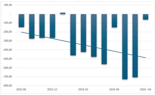Wie die untere Grafik zeigt, beschleunigt sich seit Herbst 2023 das Tempo der Abflüsse Monat für Monat. Die höchsten Abflüsse gab es im Juli und August, und auch in den ersten Handelstagen im September gingen die Rückgaben weiter. Extrapoliert man die täglichen Abflüsse der ersten fünf Septembertage auf den gesamten Monat, dann könnten die Nettoabflüsse in etwa auf dem hohen Niveau der Vormonate liegen. Wohlgemerkt: Die vorliegenden Zahlen reflektieren nicht die Kündigungen seit Beginn der nervösen Diskussion über offene Immobilienfonds im Herbst 2023. Erst die Mittelflüsse im Oktober und November werden Aufschluss geben, wie prekär die Lage bei offenen Immobilienfonds wirklich ist.