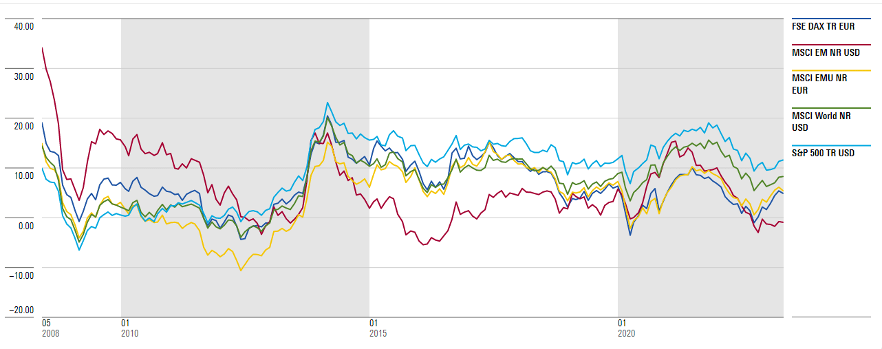 Rollierende Fünfjahres-Renditen in Ein-Monats-Sprüngen zwischen Mai 2003 und April 2023, jeder Punkt repräsentiert den Endpunkt einer Fünfjahres-Periode, annualisiert, in Prozent und in Euro, Stand: 30.4.2023, Quelle: Morningstar