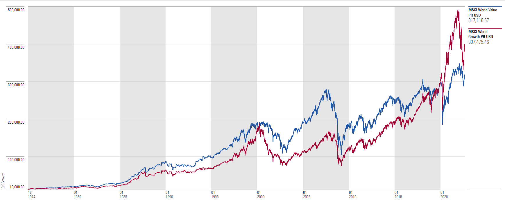 Die zugespitzte “Growth-vs.-Value-Debatte” mag für sich genommen zwar eine Scheindiskussion sein, Anleger haben aber unterschiedliche Präferenzen, und die führen zu unterschiedlichen Pfaden bei der Portfoliokonstruktion. Um das zu zeigen, vergleichen wir einmal die Performance und dann die Zusammensetzung von zwei Indizes, dem MSCI World Value und MSCI World Growth. Lange Jahre konnten Value Aktien ihre Growth Pendants outperformen. Mit der großen Finanzkrise startete Growth eine rasante Aufholjagd, und 2019 konnte der Growth Index erstmals in der gemeinsamen Historie seit 1974 den Value-Index überholen.