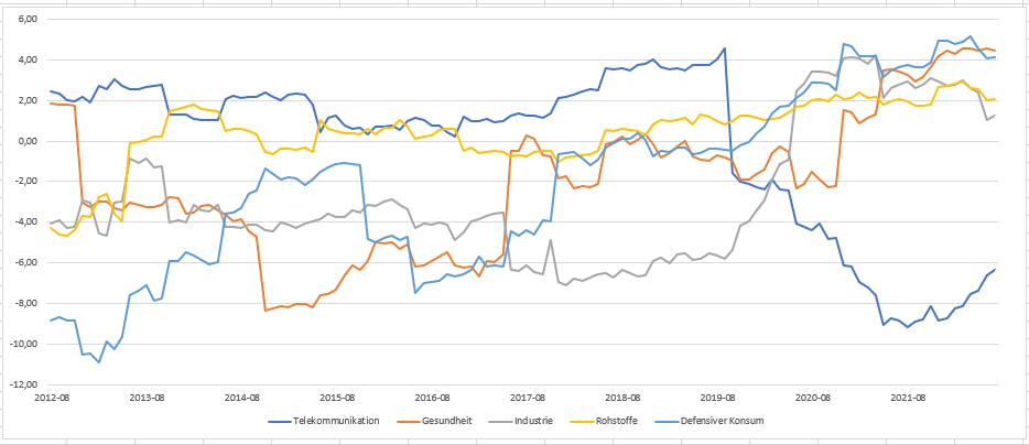 Während Telekoms lange Zeit im Value Index höher gewichtet waren, befinden sie sich seit 2019 fest im Growth-Lager. Anders ist es bei Gesundheitsaktien und Unternehmen aus dem Bereich Basiskonsum der Fall: Diese sind seit 2020 im MSCI Value Index deutlich stärker vertreten als im Growth-Index. Rohstoffaktien pendelten in den vergangenen zehn Jahren ebenfalls wild um die Nulllinie. Wenn also Value-Investoren die Dividenden-Qualitäten von Telekom-Aktien schätzen, müssen sie sich vergewissern, ob diese tatsächlich in ihrem klassischen Value-ETF vertreten sind. Und wer meint, dass Pharma immer im Growth-Lager zu finden ist, sollte dringend seinen Fonds-Screener anschmeißen.