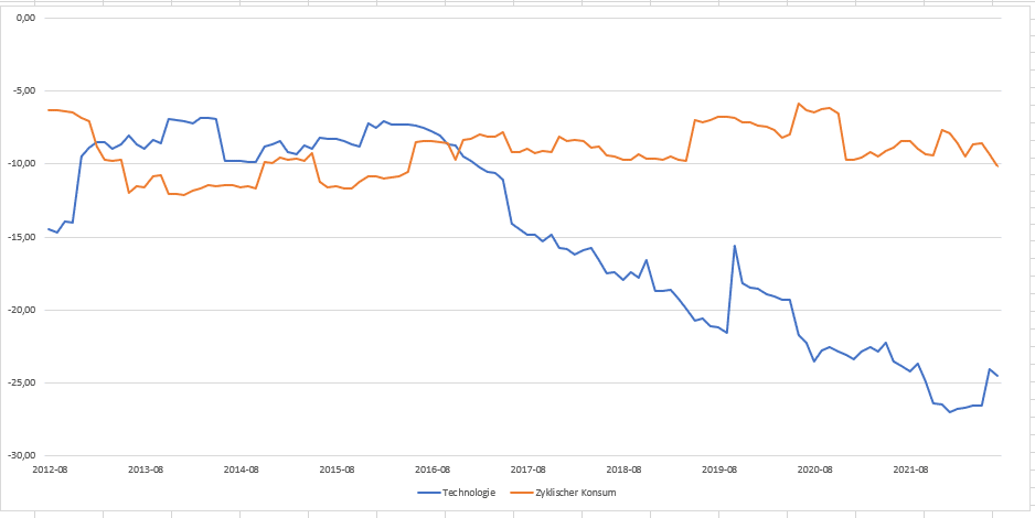 Spiegelbildlich dazu finden sich Aktien aus den Sektoren diskretionärer Konsum und Technologie konstant in Growth-Portfolios übergewichtet. Bei Tech-Aktien ist die Unwucht bedenklich. Sie waren in den vergangenen Jahren um 20 bis 25 Punkte höher vertreten als in Value-Portfolios. (Absolut gesehen machen Tech-Aktien rund ein Drittel des MSCI World Growth aus; im MSCI Value sind sie dagegen nur mit rund acht Prozent dabei)