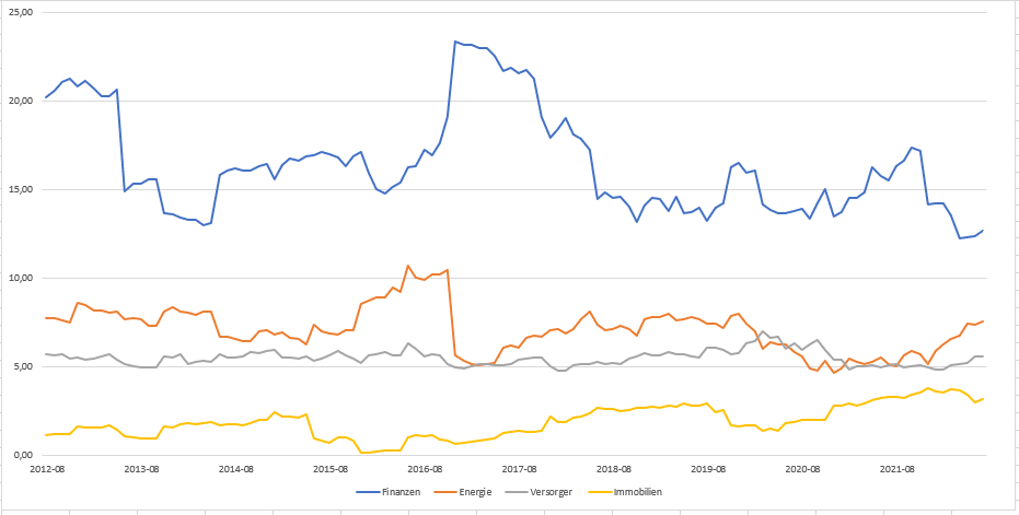 Kommen wir nun zur Zusammensetzung der beiden Indies. Finanztitel, vor allem Bankaktien, sind seit jeher hoch in Value-Portfolios gewichtet – mitunter höher, als es der Performance gut tut, wie etwa während der großen Finanzkrise oder in Phasen niedriger Zinsen sowie in politisch turbulenten Zeiten. Nicht von ungefähr fällt die langjährige Value-Malaise 2010 bis 2020 mit dem nachhaltigen Abschwung von Bankaktien zusammen.