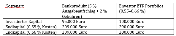 Die ETF-Portfolios von envestor sind eine hervorragende Alternative für Langfristanleger. Gerade Anleger mit kleinem Geldbeutel sind mit ETF-Portfolios besser bedient als mit dem Fondsvertrieb der Banken und Sparkassen. Langfristanleger sollten auf leistungsstarke, günstige ETF-Portfolios statt auf teure Fonds setzen.